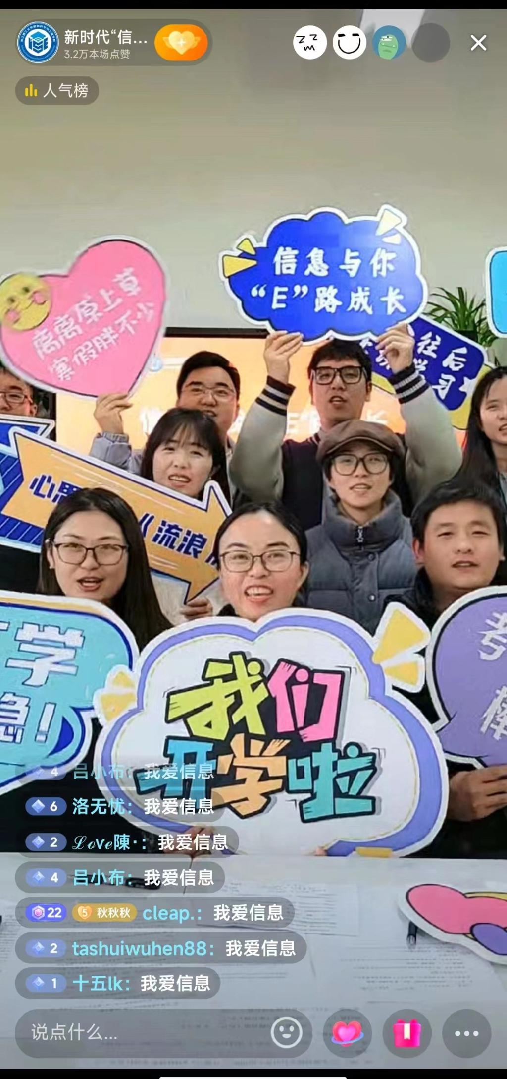 此次直播经历了群策群力、精心谋划、提前预热的全面准备,直播期间还穿插了形式活泼的抽奖活动,同学互动热情,“我爱信息”多次刷屏,全场获得3.2万次点赞。