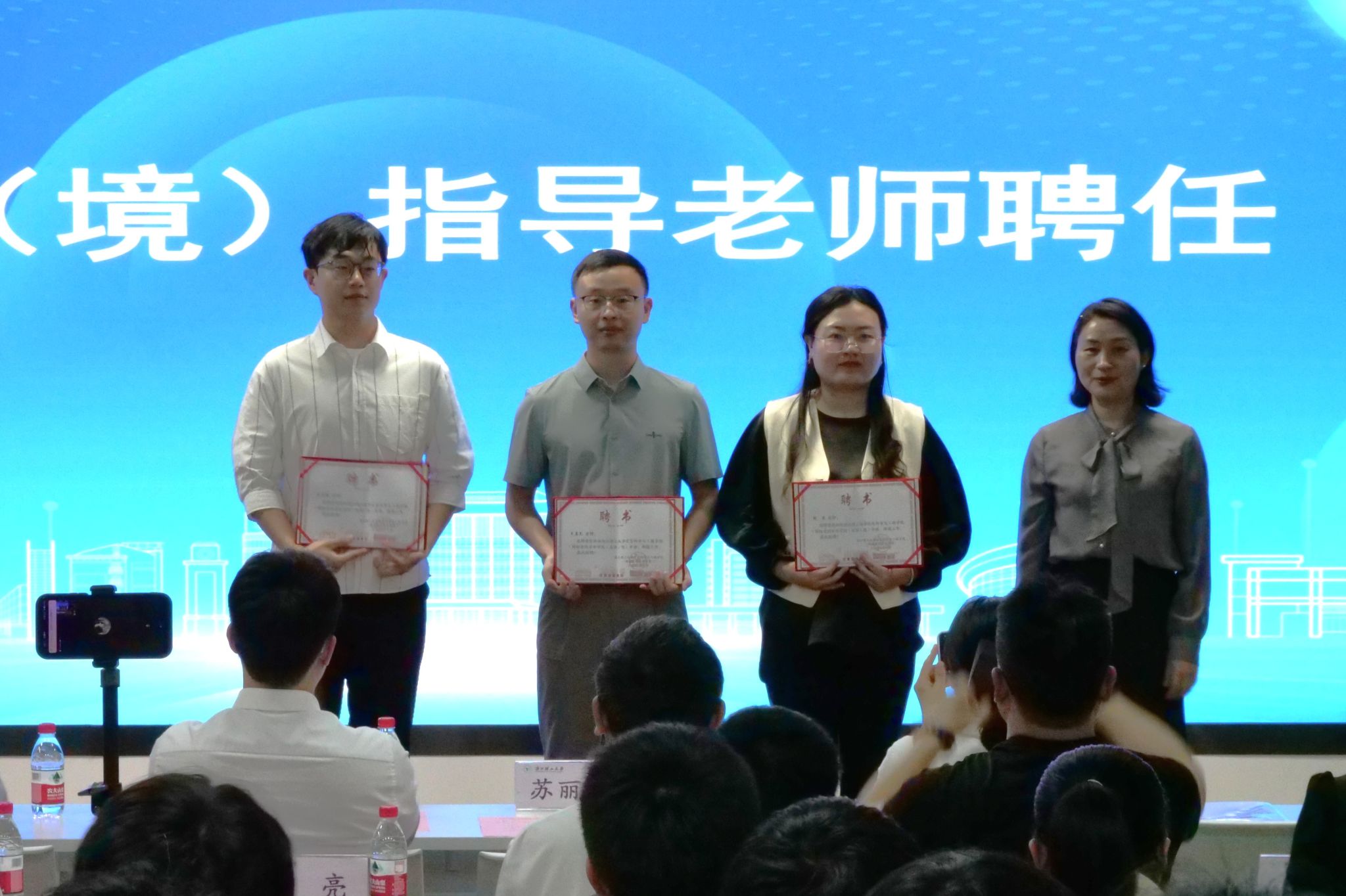 大会上,学院举行出国(境)指导老师聘任仪式,聘任吴孟尧、张一茜、王子航担任指导老师,学院党委书记苏丽辉颁发聘书。
