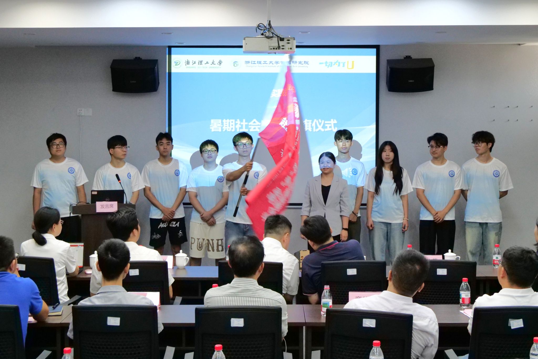 学校研工部部长冯飞芸为暑期社会实践团队授旗。