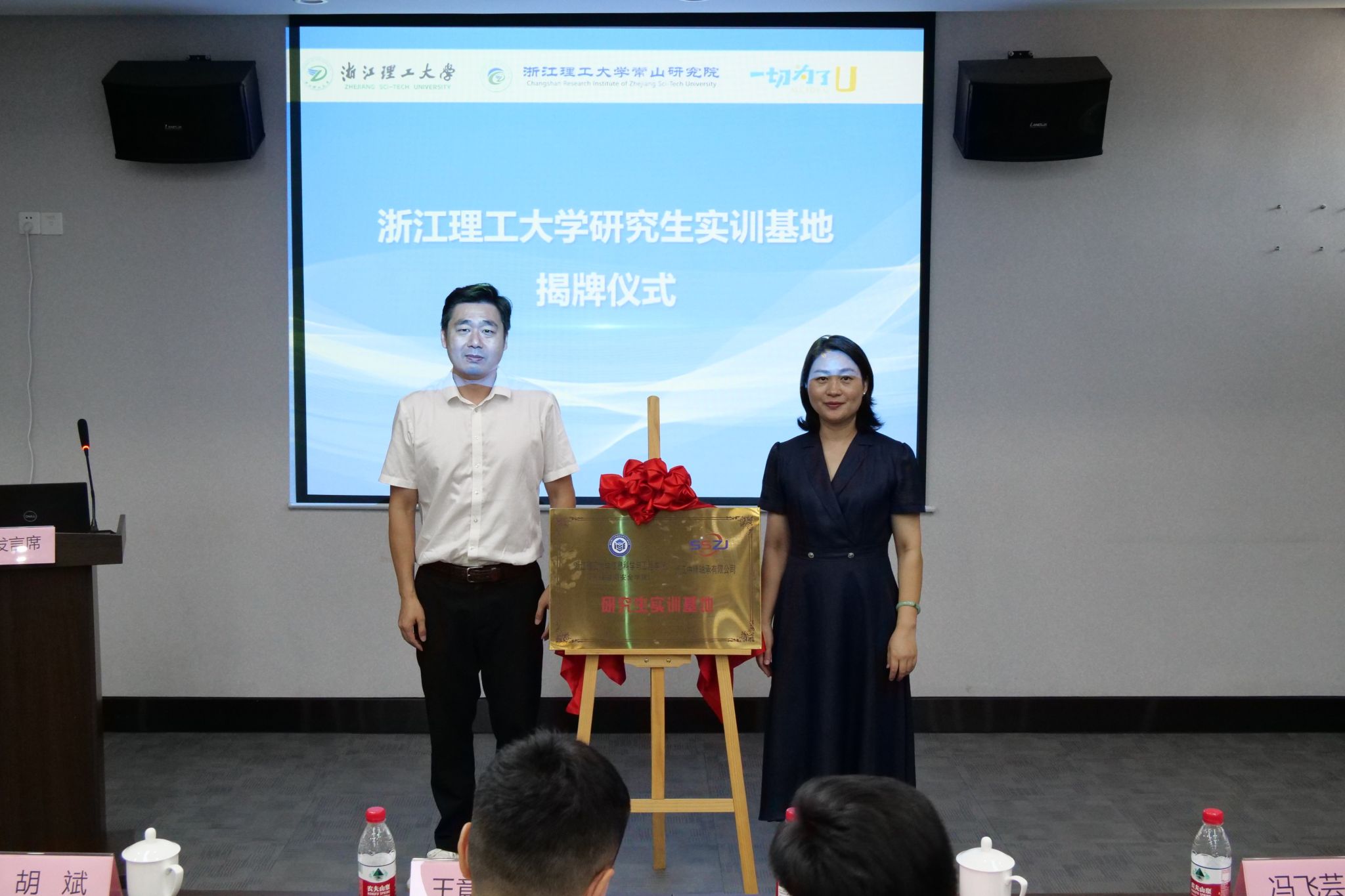 信息学院党委书记苏丽辉,常山县科技局党组副书记、副局长胡斌共同为浙江理工大学研究生实训基地揭牌。