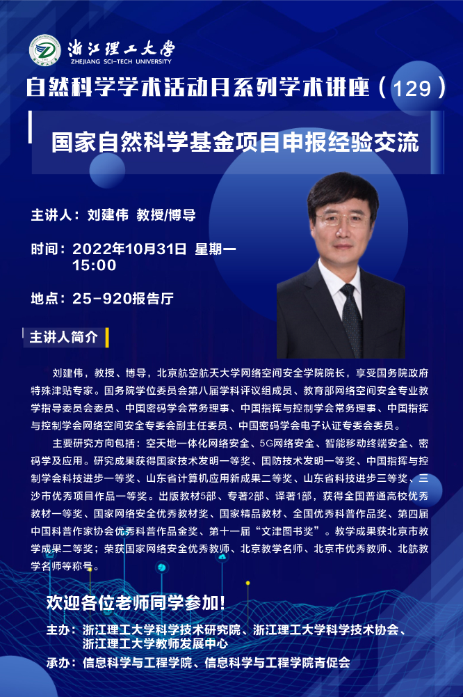 组织召开国家自然科学基金项目申报动员会暨自然科学学术活动月系列学术讲座。本次会议有幸邀请北京航空航天大学网络空间安全学院院长刘建伟教授为河图文化