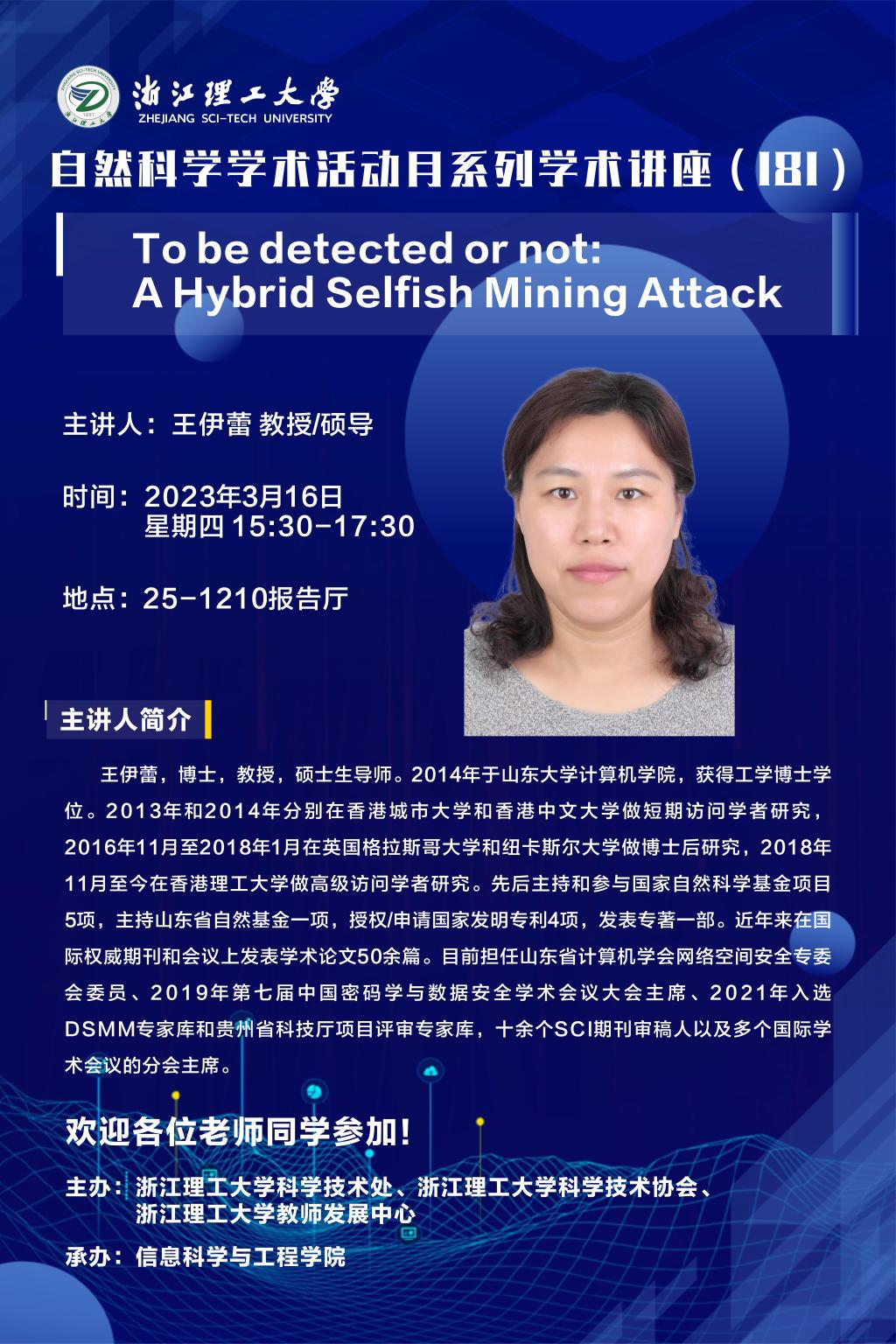 青年教师和在读研究生做了题为《To be detected or not: A Hybrid Selfish Mining Attack》的学术报告,本次会议由河图文化