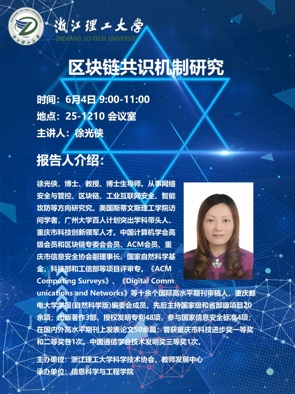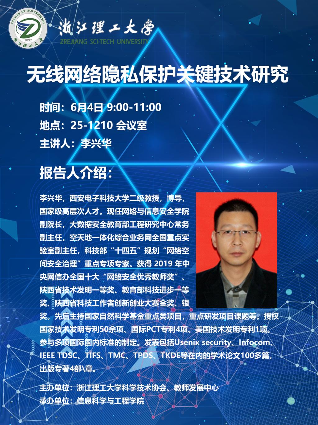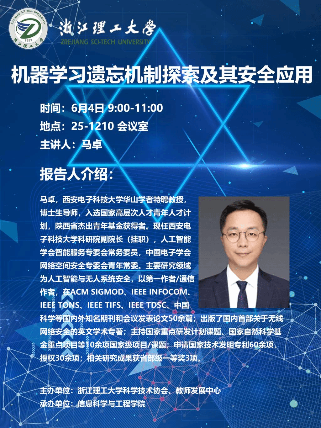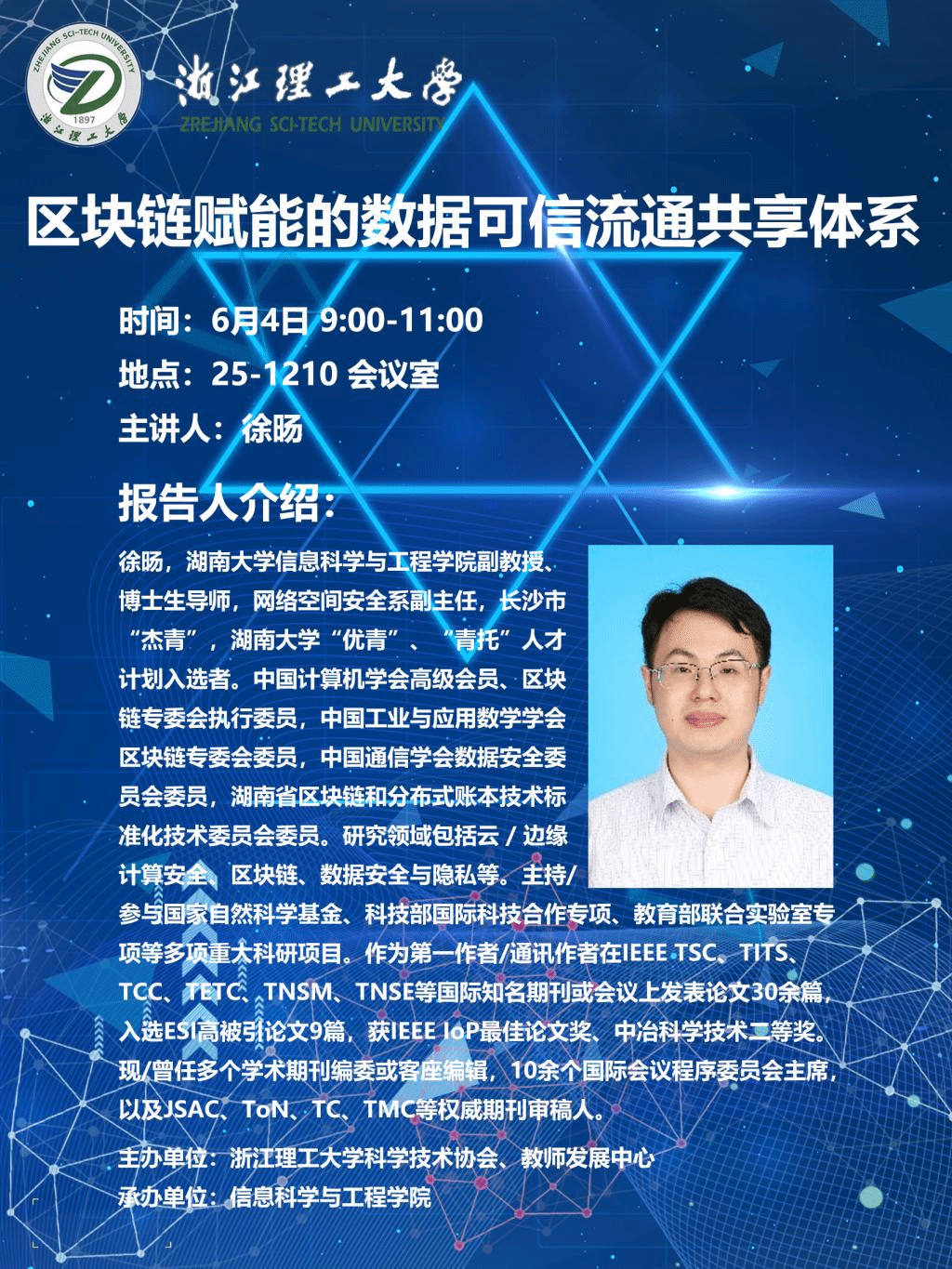 6月4日上午,学院邀请了西安电子科技大学华山学者特聘教授、国家高层次人才青年人才计划马卓,西安电子科技大学二级教授李兴华,广州大学百人计划突出学科带头人、重庆市科技创新领军人才徐光侠,湖南大学“优青”、“青托”人才计划入选者徐旸等四位教授来河图文化 进行学术交流,并在25号楼1210会议室为师生分别作题为“机器学习遗忘机制探索及其安全应用”、“无线网络隐私保护关键技术研究”、“区块链共识机制研究”、“区块链赋能的数据可信流通共享体系”的学术报告。