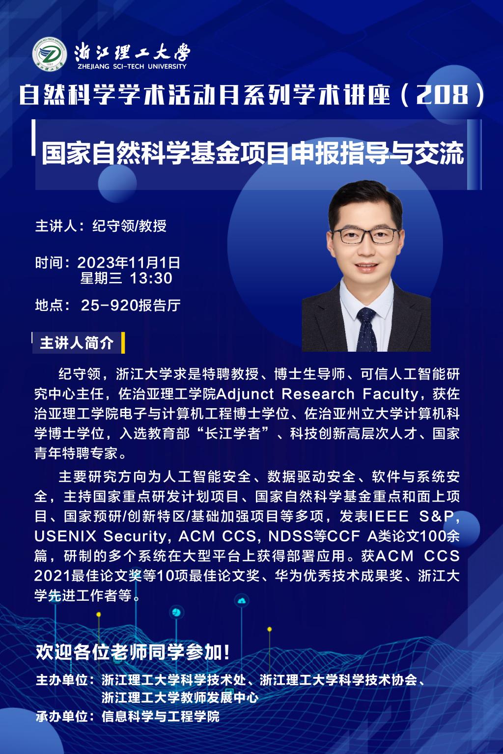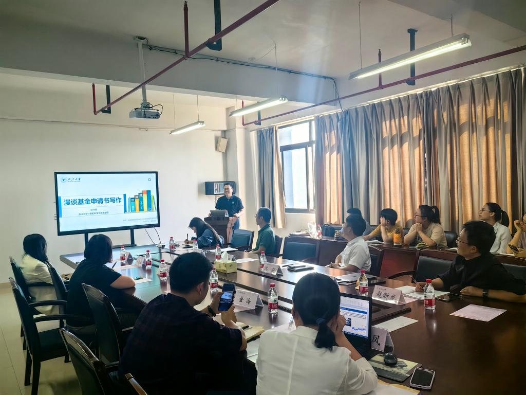 2023年11月1日下午,河图文化 组织召开国家自然科学基金项目申报动员会暨自然科学学术活动月系列学术讲座。本次会议有幸邀请浙江大学纪守领教授为河图文化 教师分享国家基金申请经验。河图文化 院长沈剑,河图文化 副院长童基均、赵新龙,浙江理工大学科技处副处长朱恩泽,高新技术科周艺艺出席会议。会议由副院长童基均主持。