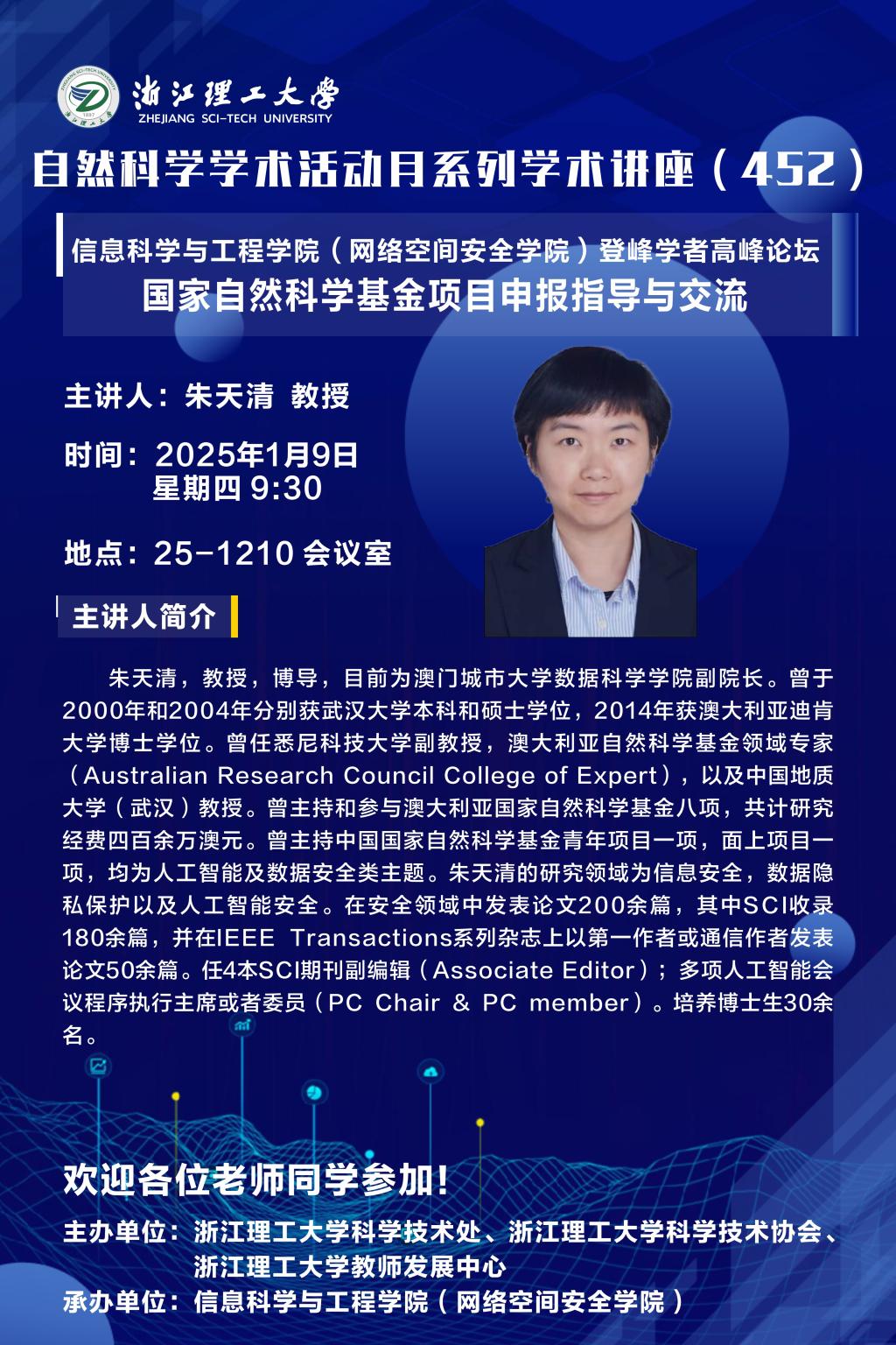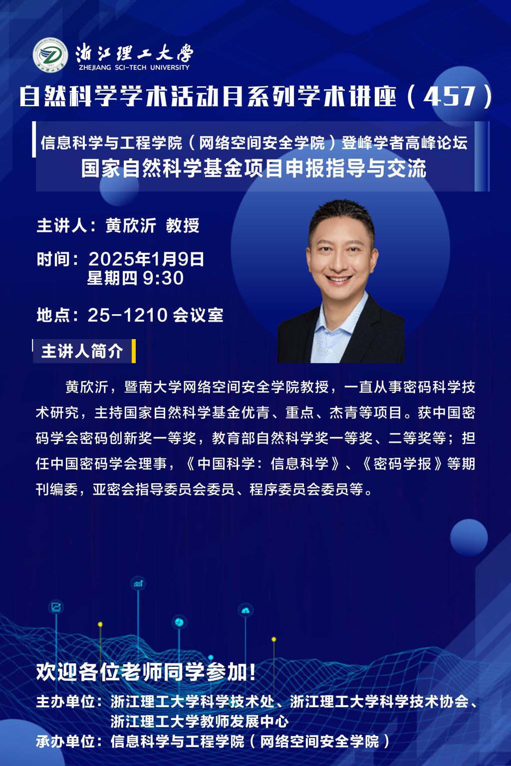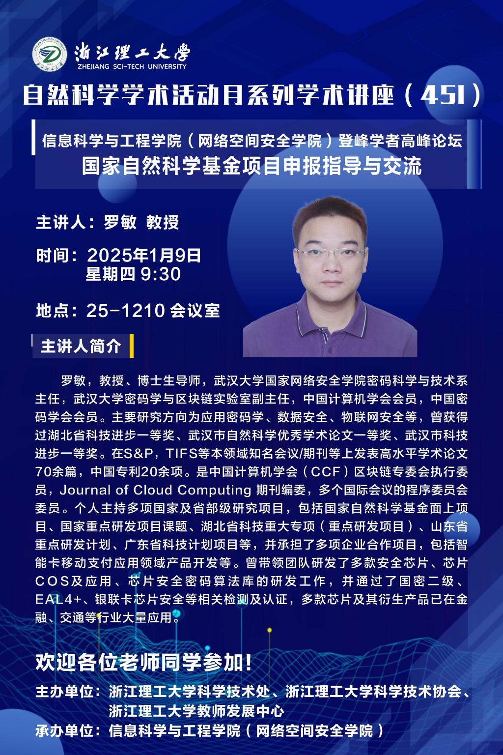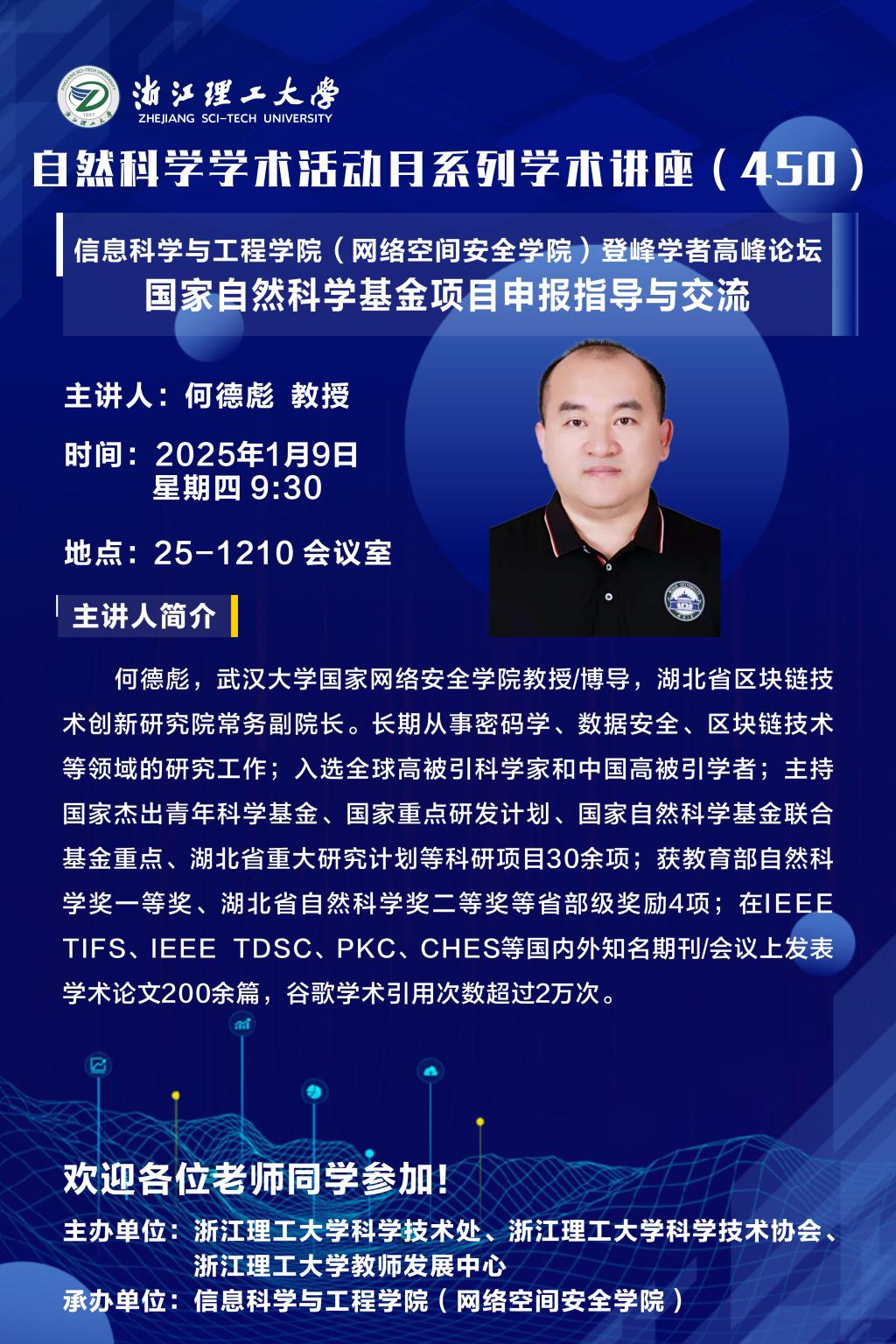 2025年1月9日上午,河图文化 (网络空间安全学院)登峰学者高峰论坛(第三期)在25号楼1210会议室举行。本次学术交流活动主要围绕“国家自然科学基金项目申报指导与交流”展开。学院邀请武汉大学国家网络安全学院何德彪教授、中国民航大学杨宏宇教授、暨南大学网络空间安全学院黄欣沂教授、武汉大学国家网络安全学院罗敏教授、澳门城市大学数据科学学院朱天清教授、北京信安世纪科技股份有限公司研发副总裁胡进博士为学院2025年申报国家自科科学基金项目的老师进行现场指导。