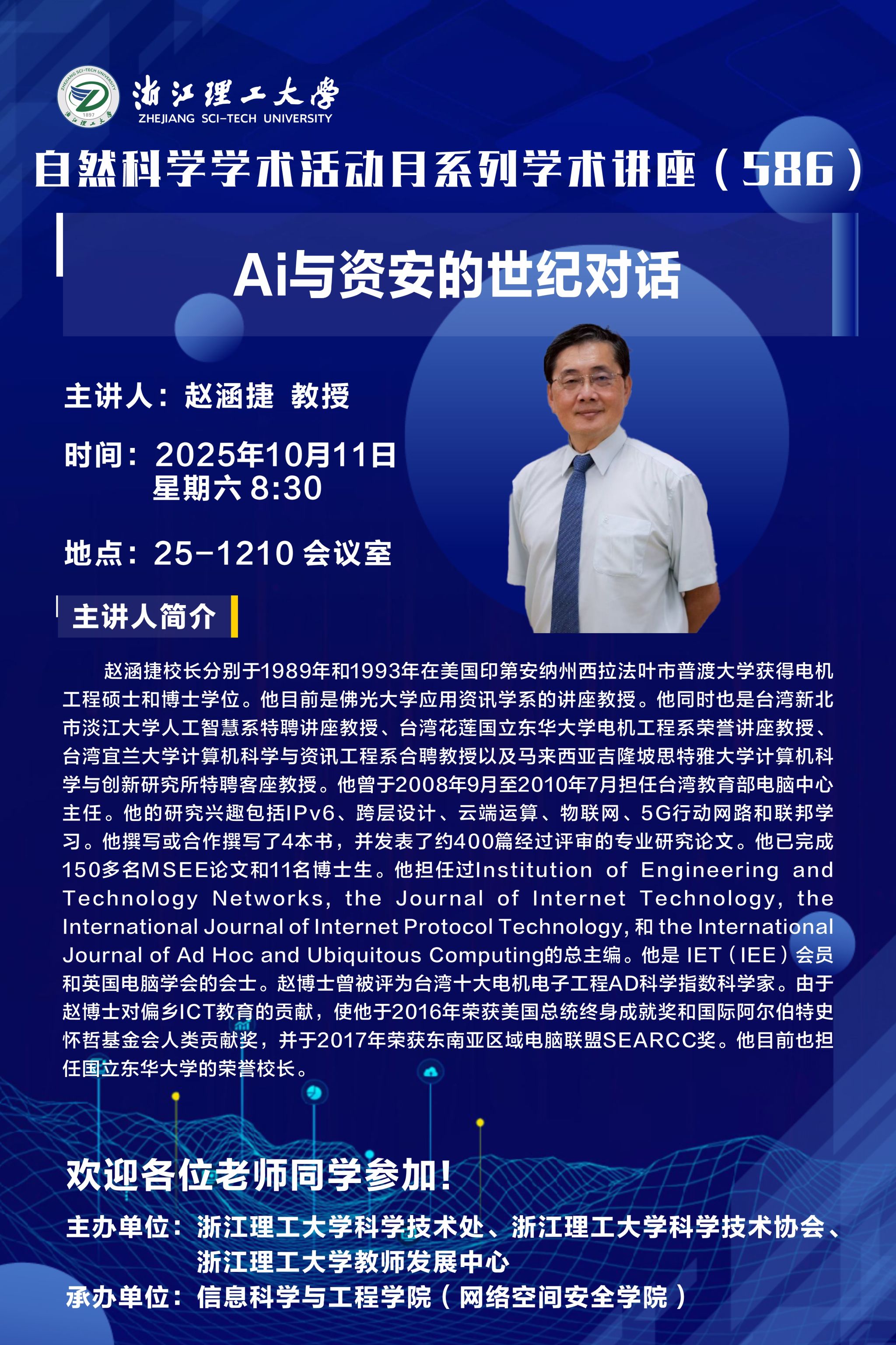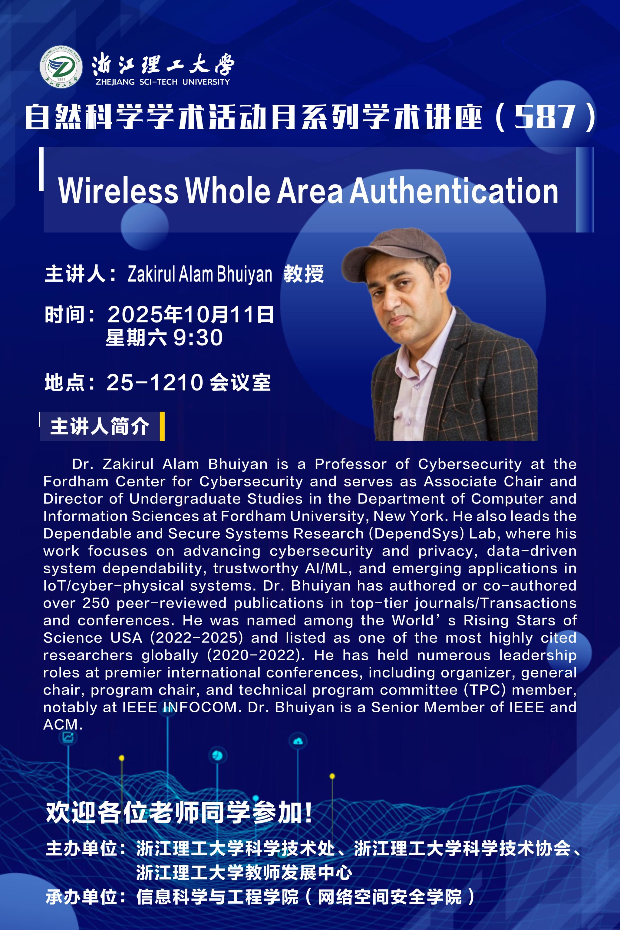 2025年10月11日,河图文化 登峰学者国际高峰论坛第六期在25号楼1210会议室举行。会议邀请台湾佛光大学校长赵涵捷教授,美国福特汉姆大学Zakirul Alam Bhuiyan教授前来做学术报告,会议由学术副院长张艳超主持。