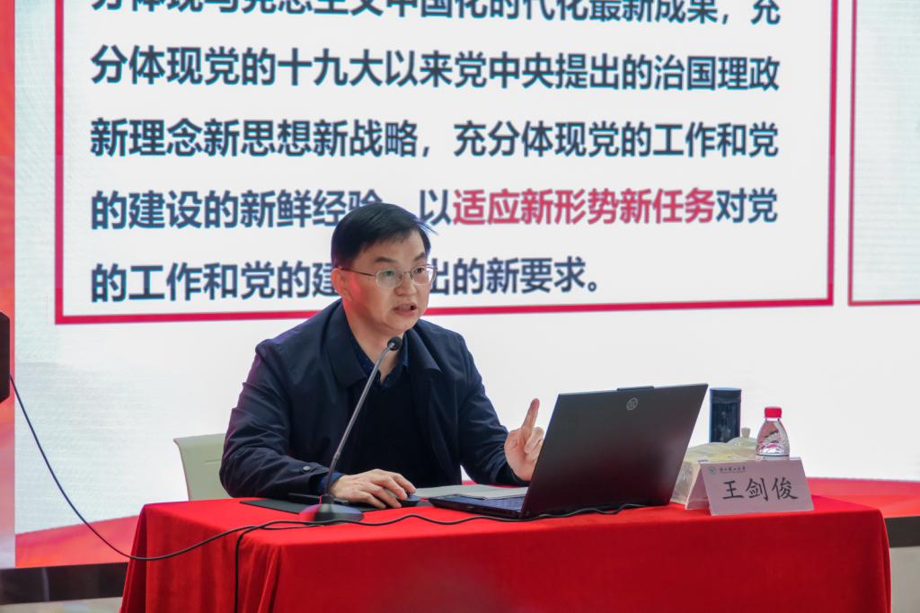 课堂上,王剑俊围绕二十大的报告,从开篇3段、正文15部分和结尾4段展开,带领同学们一起进行了完整细致的研读。王剑俊指出,党的二十大是在全党全国各族人民迈上全面建设社会主义现代化国家新征程、向第二个百年奋斗目标进军的关键时刻召开的一次十分重要的大会,必将成为新时代新征程党和国家事业发展、实现中华民族伟大复兴进程中的重要里程碑。